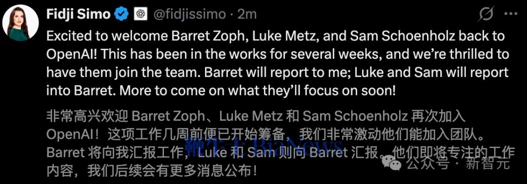 在Mira发布声明后的不到一小时,Simo便发帖欢迎Barret Zoph、Luke Metz和Sam Schoenholz的回归。