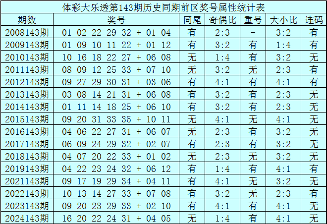 体彩大乐透第143期历史同期开出16次奖号,其统计详见下表: