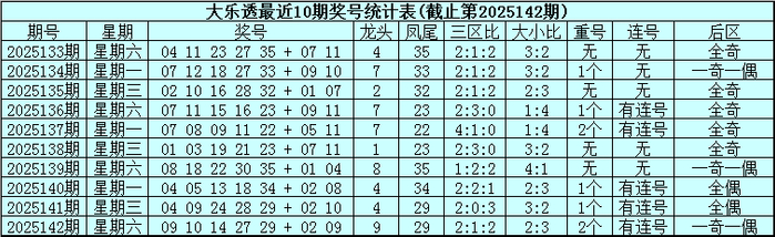 大乐透第2025142期奖号为:09、10、14、27、29+02、09。其中前区三区比为2:1:2,大小比为2:3,包含2个重号,包含连号,后区为一奇一偶号码。